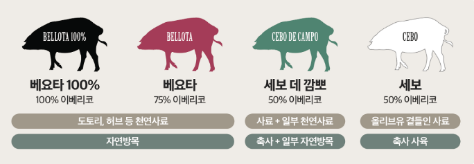 그러나 모든 이베리코 돼지가 도토리 사료를 먹고 자라는 것은 아닙니다. Iberico는 차례로 클래스로 나뉩니다. 탑 베요타방목하여 야생 도토리를 먹인 순종 이베리코입니다. 방목하여 키우기 때문에 운동량이 많아 고기가 질기다. 중산층 세보 데 캄포’이베리코와 다른 품종의 교잡종입니다. 그들은 마구간과 방목을 번갈아 가며 도토리와 마초를 혼합하여 먹입니다. 세보, 가장 낮은 음 역시나 잡종이고 세보는 그냥 마구간에서 살며 밥을 먹인다. 이베리코 돼지는 지방이 많아 맛있지만 번식력이 좋지 않아 생산성이 낮다.
