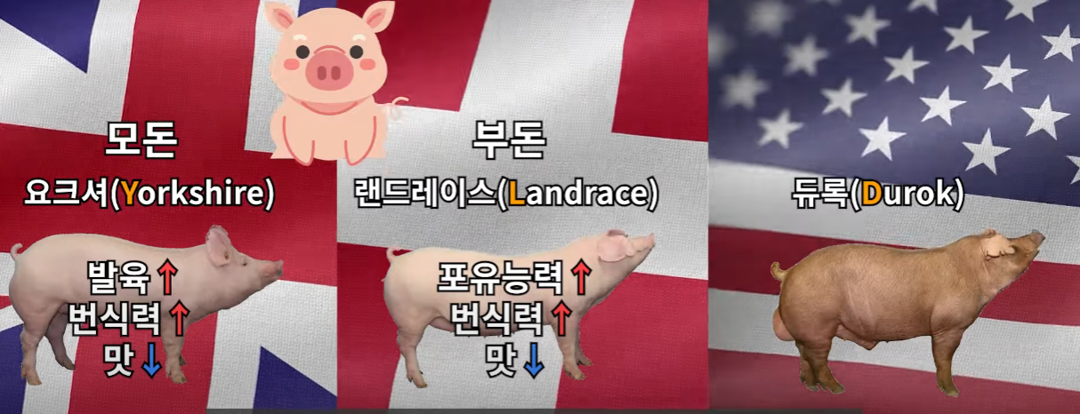 YLD는 Yorkshire(영국), Landrace(덴마크) 및 Duroc(미국)을 나타냅니다., 이 세 가지의 혼합을 의미합니다. 새끼돼지(YL)는 성장이 빠르고 번식력은 좋으나 맛이 좋지 않은 어미돼지로 요크셔를, 수유능력과 번식력은 좋으나 고기맛이 없는 랜드레이스를 아비돼지로 사용하여 생산된다. 이 YL은 고기 맛이 뛰어난 Duroc과 다시 교차됩니다. 이 과정을 3차 교배라고 하며 그 결과 돼지를 YLD 품종이라고 합니다.
