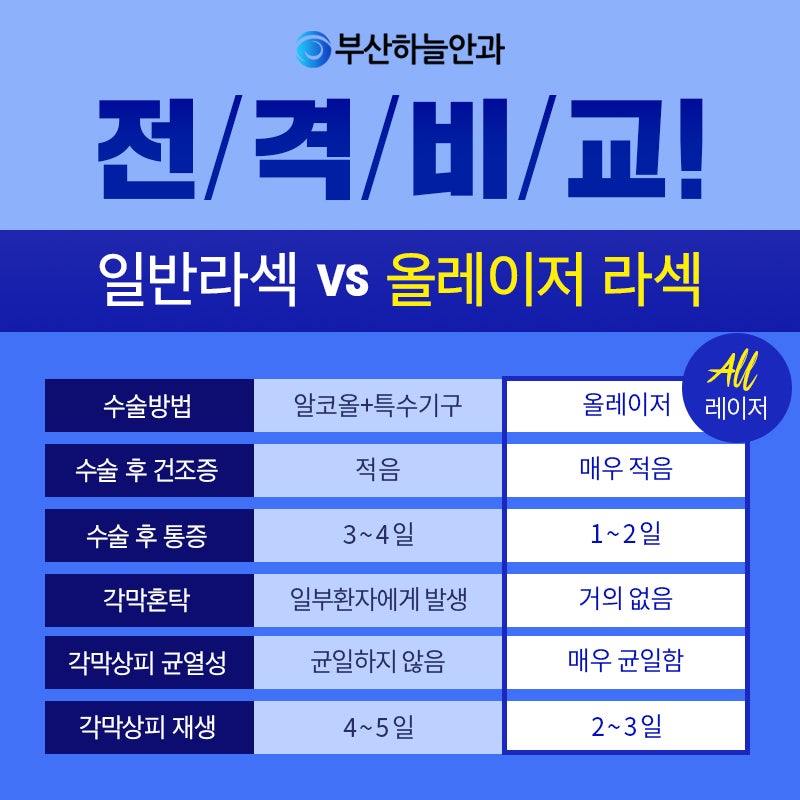 이틀 만에 통증에서 회복되어 주말 수술이 가능합니다. 안구건조증 발생률이 일반 라식에 비해 적습니다. 수술 후 각막 혼탁이 적습니다. 일반 라섹에 비해 시력 회복이 빨라요.