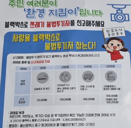 신고 포상의 대상은 일반 대중이어야 하며, 환경 관련 종사자나 공무원은 포상 대상에서 제외됩니다. 그리고 최대 보험료 납입 횟수는 월 5회, 연간 10회를 초과할 수 없습니다. 관련 문의는 052-290-3780으로 전화주세요. 약간의 관심이 깨끗한 거리와 인식을 바꿀 수 있습니다. 감사해요