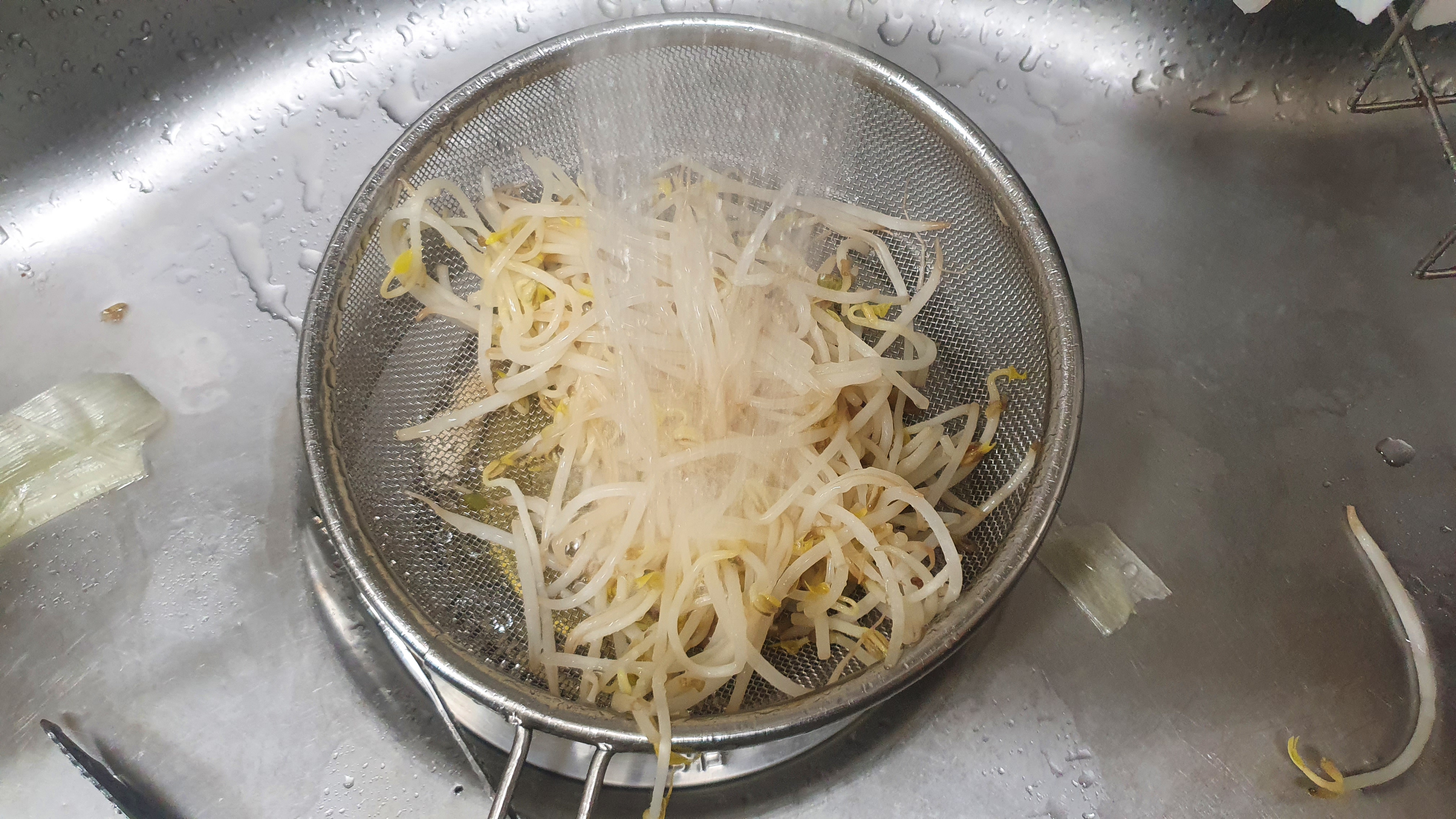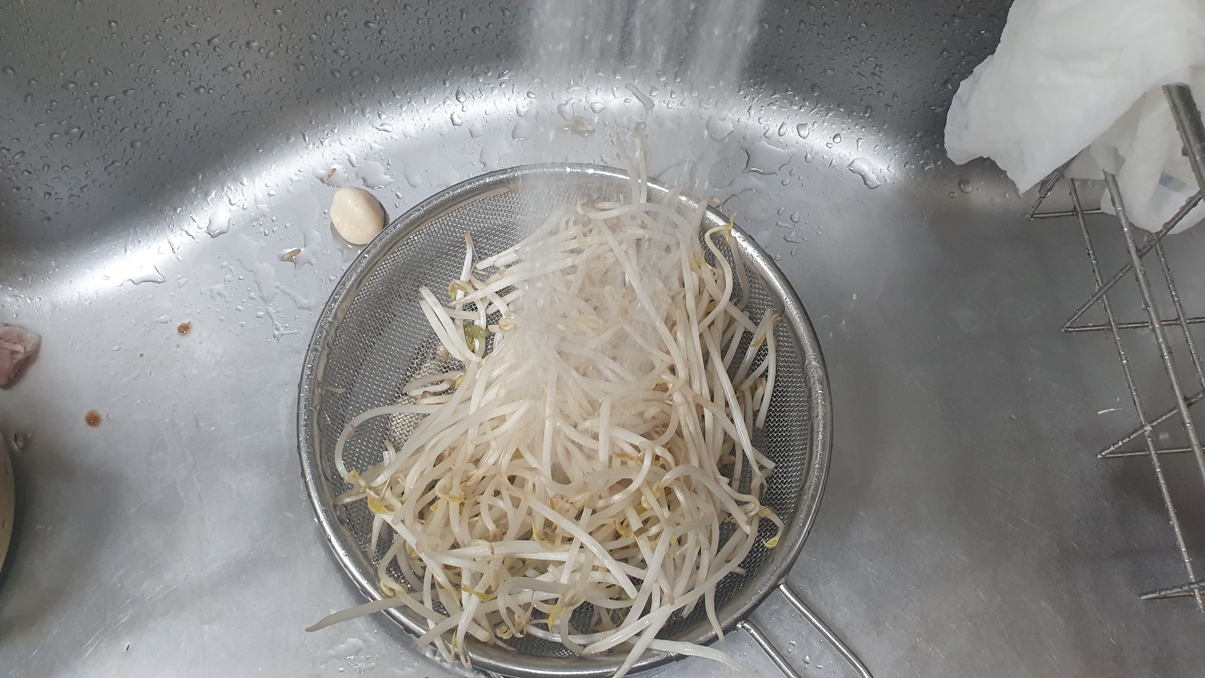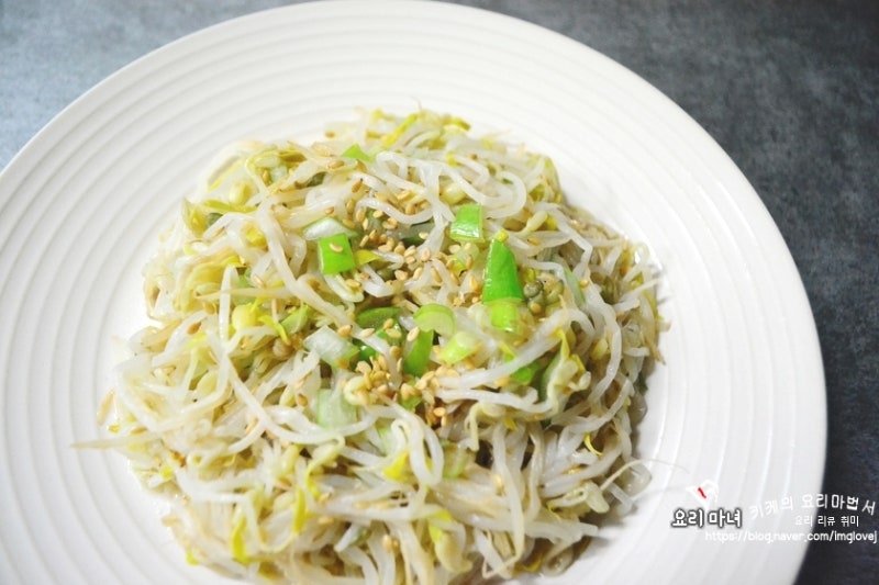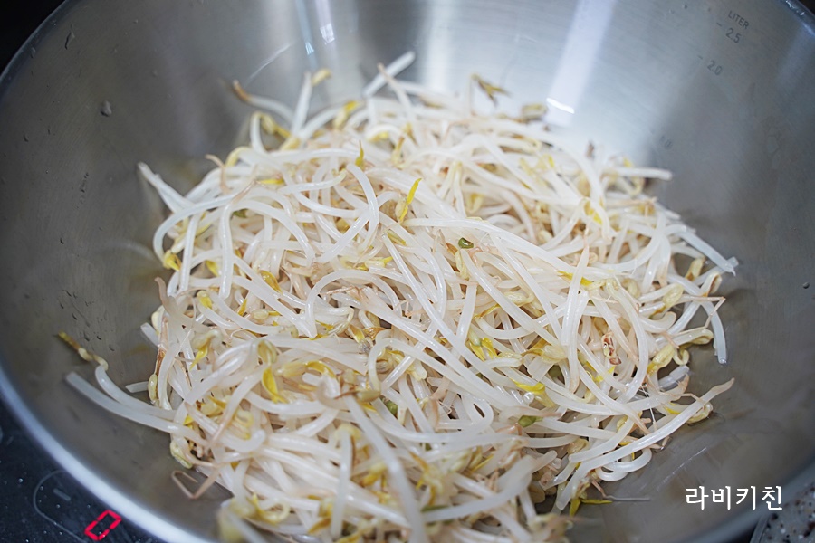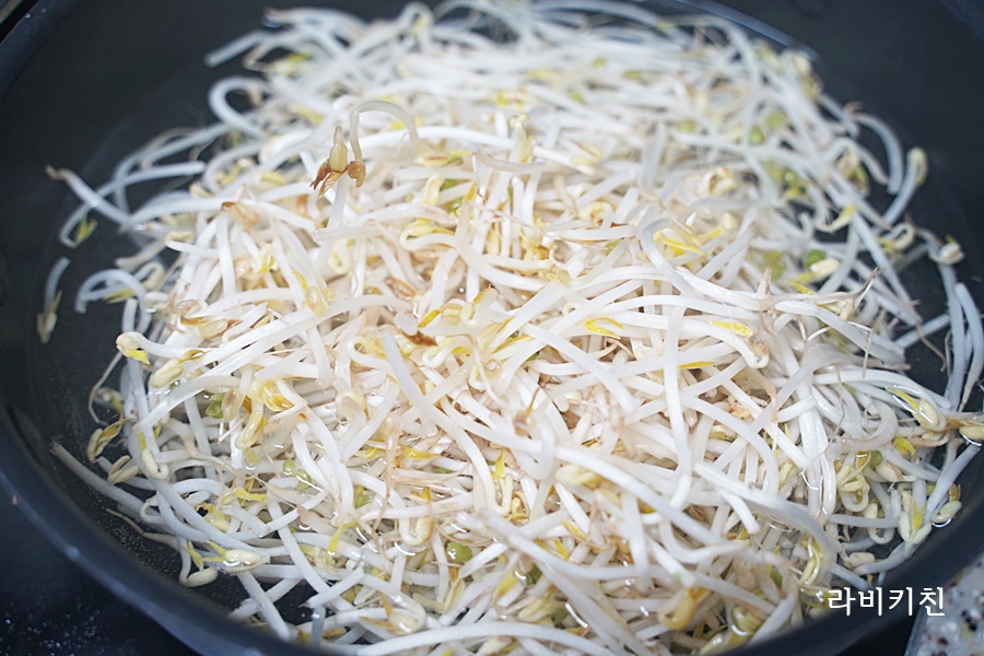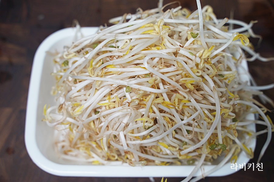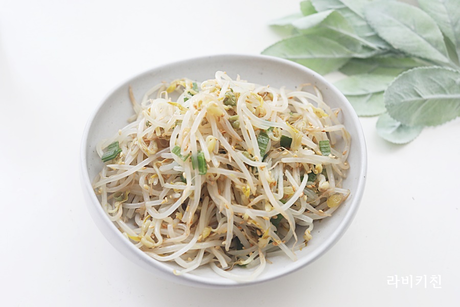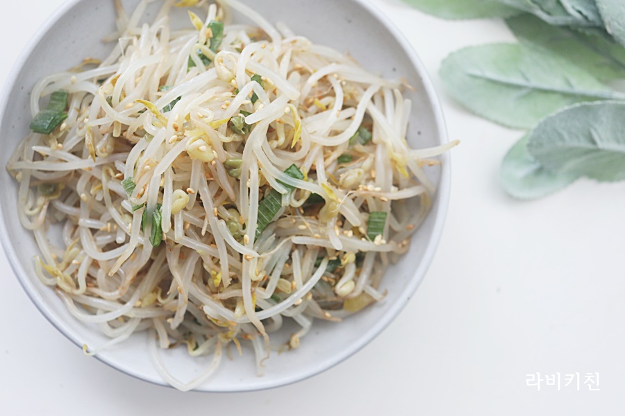 콩나물입니다. 살짝 데친 콩나물에 소금, 참기름, 통깨만 넣고 버무립니다.