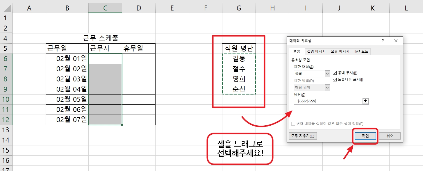 목록을 클릭한 후 드롭다운 목록에 표시할 셀을 선택해야 합니다.